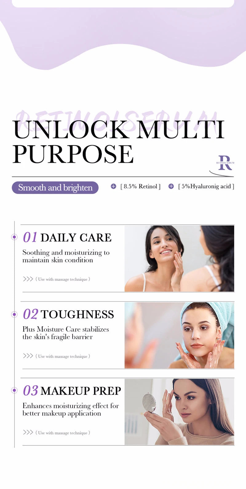 Moisturize and anti-wrinkle,diminish fine lines,improve rough and smooth skin, rejuvenate and brighten skin smooth, firm,plump and delay aging.